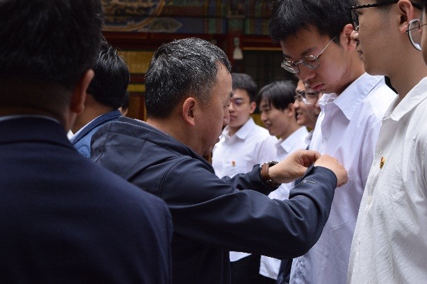 宣誓完毕后,教工党员代表为预备党员佩戴党徽。