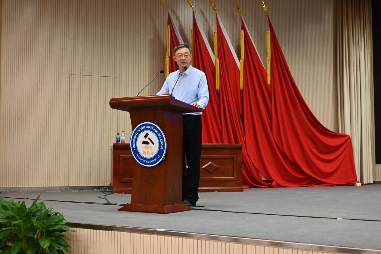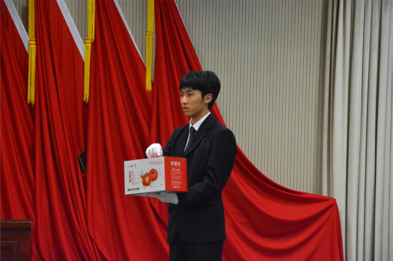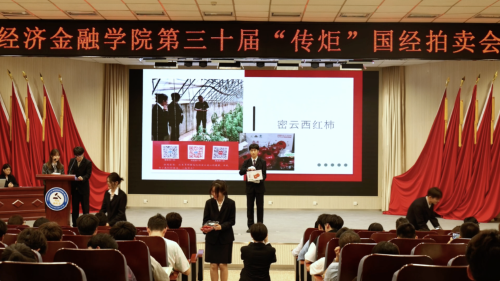 国际关系学院副院长许可教授为本次国经拍致辞并开槌,他充分肯定了国经拍的重要意义与积极影响,并大力推荐了经院学生党支部“红色1+1”共建单位的农产品——密之蓝天水果西红柿这一公益拍品。