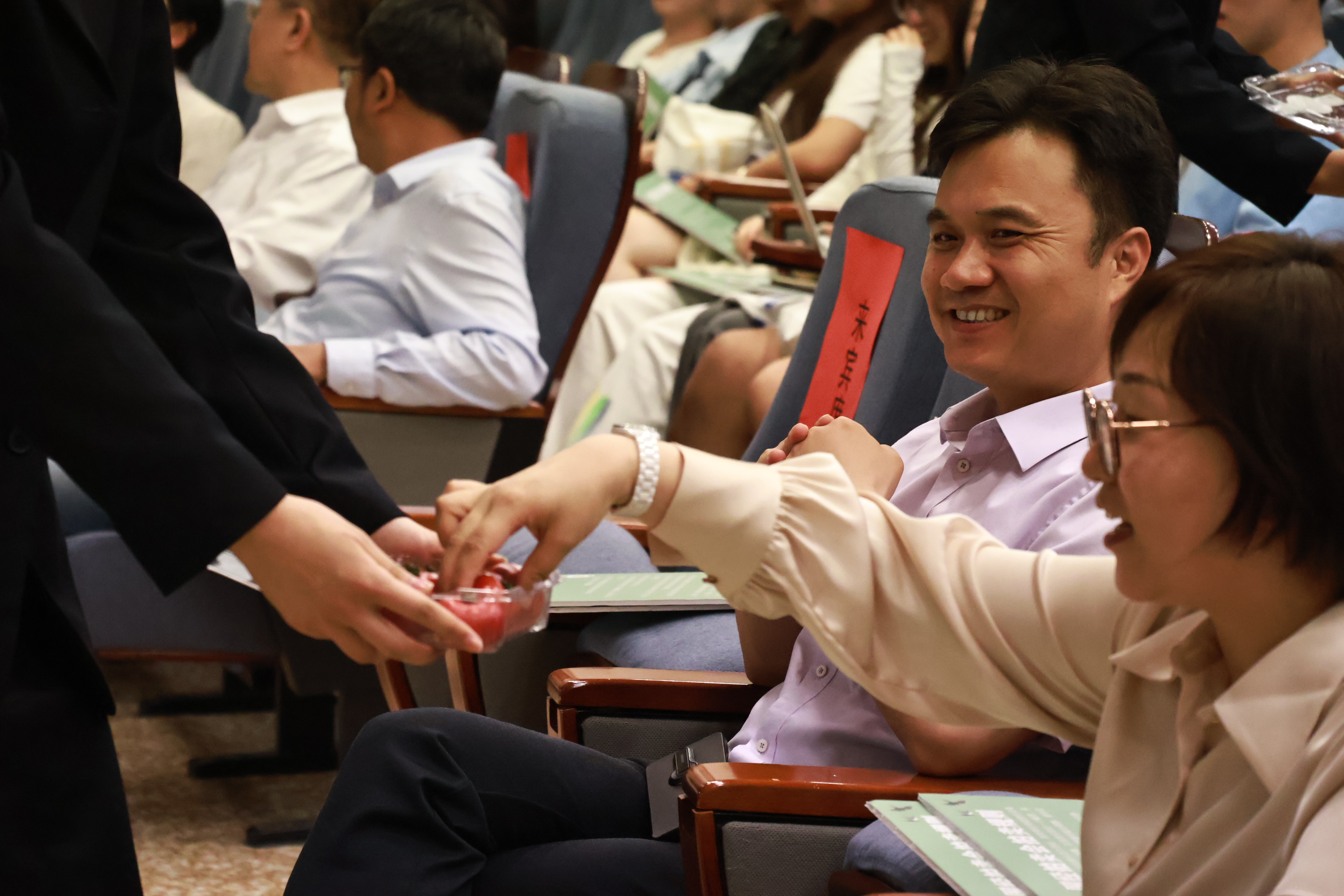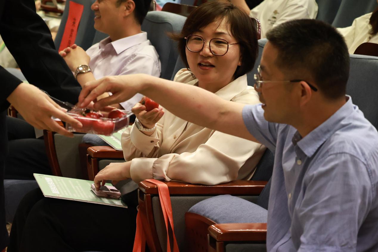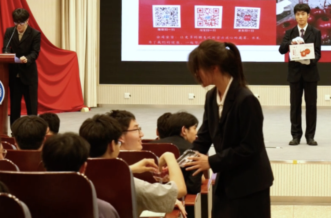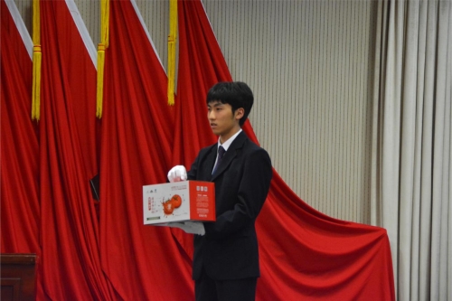 公益拍品由四个拍品组成,分别是外语学院张雅雯老师提供的时代经典、经院提供的文创礼盒、经院23级陆承斐同学提供的aroma香薰和经济金融学院学生党支部红色“1+1”共建单位—密云区巨各庄镇豆各庄村提供的当地特色农产品—密之蓝天水果西红柿。该拍品的拍卖在现场掀起了又一轮竞价高潮,拍卖师在台上介绍着该拍品的特点,台下来宾体验着来自密云的特色农产品连连称赞。
