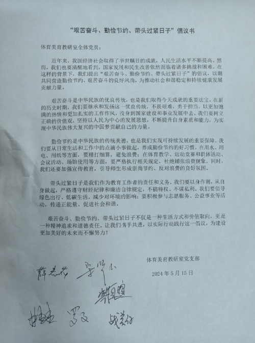 最后,体育美育教研室党支部全体党员共同签署了“艰苦奋斗、勤俭节约、带头过紧日子”倡议书,并庄严承诺将以此次活动为契机,进一步发挥党员的先锋模范作用,以实际行动践行党的宗旨和使命。