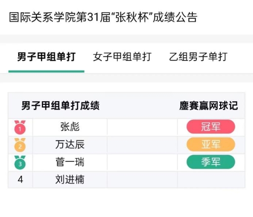 甲组男单采用小组赛加淘汰赛的赛制进行,共设有4组,每组前两名出线,进而进行后续比赛。在本次甲组男单比赛中,我校大一至大三年级均有选手报名,且每位参赛选手都打出了很好的表现。在首轮比赛中,刚接触网球不到一年的new birds打出了属于他们的锐气,让接触网球两三年的师哥们大吃一惊,也为后续精彩的比赛奠定了基础。
