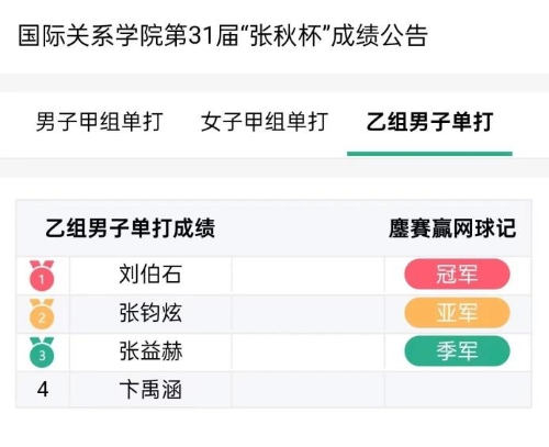 乙组男单采用和甲组男单赛制同样的小组加淘汰赛制,分为上下半区,每组前两名出线,在小组赛中大一新生张益赫和魏广轩都是首次参与张秋杯的单打比赛,但他们的表现仍让人眼前一亮,打出了很多精彩的制胜分。而后张益赫、刘伯石进行下半区的淘汰赛,张钧炫、卞禹涵则在上半区展开厮杀,值得一提的是两场比赛均打至抢七环节,选手们拼尽全力去赢下每一分,其中刘伯石更是在大比分1:3落后的情况下紧咬比分最终收下胜利,并在决赛中顺利登顶,获得乙组男单冠军。