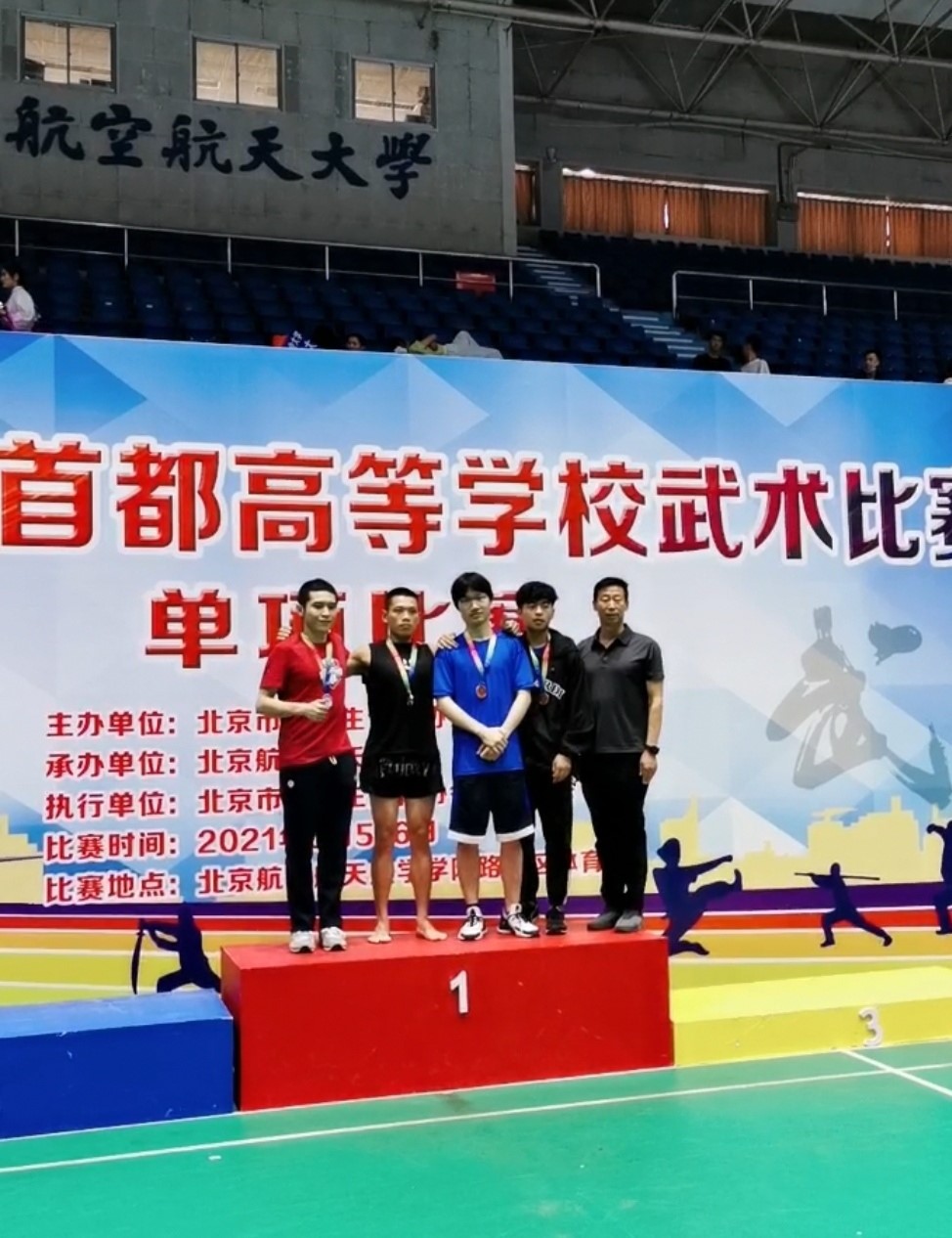由北京市大学生体育协会主办,北京航空航天大学承办的2021年首都高等学校武术比赛(单项比赛)于6月5日在北京航空航天大学体育馆举行。此次比赛项目分为套路与散手两大类,共有33所北京市高等院校280名大学生参加角逐。我院武术队在刘明亮老师的带领下派出1名运动员参加套路项目,3名运动员参加散手项目,均取得优异成绩。