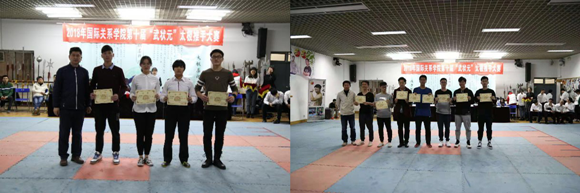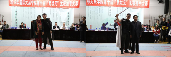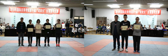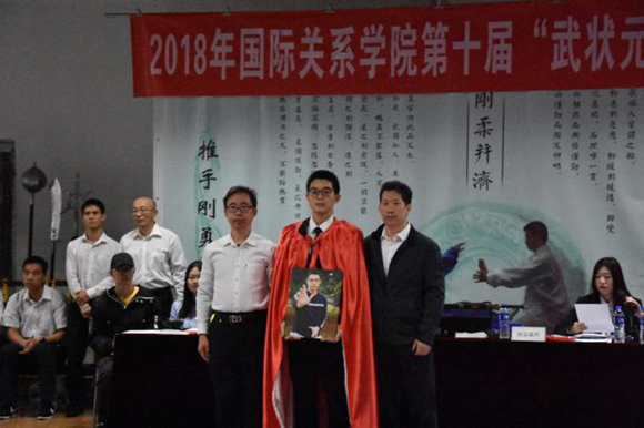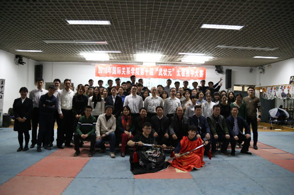2018年12月1日上午,由国际关系学院体育委员会主办,体育美育教研部承办,国关武术协会、院武术队及武术文化研究部联合协办的第十届“武状元”推手大赛在校武术馆圆满落幕。出席本次大赛的嘉宾有国际关系学院副校长李家兴、学生处处长芮雪源、法律系主任毕雁英、体美部主任尹钊、信科学院副书记朱小京老师、公管系副主任邓陆、外语学院副书记刘理鼎和财务处副处长王延忠、后勤服务中心副处长王劲松。