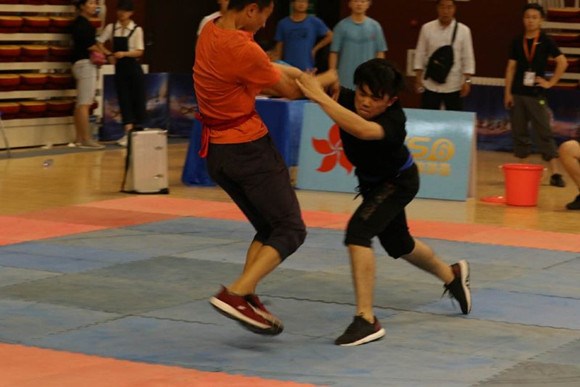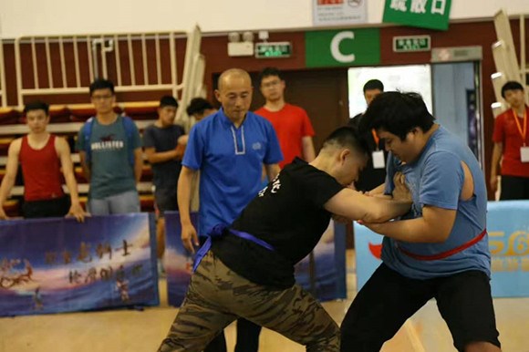 太极推手是我校的传统优势项目,然而随着这项运动普及程度的提高,各大高校涌现出越来越多实力强劲的对手。面对部分来自体育院校的武术特长生,我校队员们依旧打出了气势,向所有人展现出国关武术人顽强拼搏的精神。在活步推手60公斤级比赛中王印披荆斩棘、力挫对手,勇夺该级别比赛的冠军。