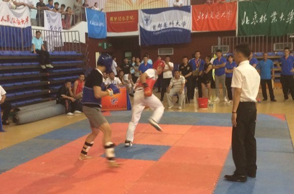 在今年的功夫对抗赛场(散打)上,我校有四名队员参赛。首先出场的是60公斤级的周乙成,作为敏捷型运动员,在比赛中他利用灵活的走位出奇不意地打击对手,最终进入八强,获得该公斤级五名的成绩。70公斤级出场的朱恭博身体素质硬朗、拳腿配合得当,同样获得第五名。75公斤级的王牧晨凭借较强的心理素质和推擂技术赢得首站胜利,但在进入半决赛时,因为腿法的劣势不敌公安大学的散打队员,最终获得第三名。而在80公斤级出场的是实力最强的索金,索金拳法犀利,一路上高歌猛进,进入决赛。在决赛不敌擅长远距离腿法攻击的公安大学队员,以稍微劣势位居第二。