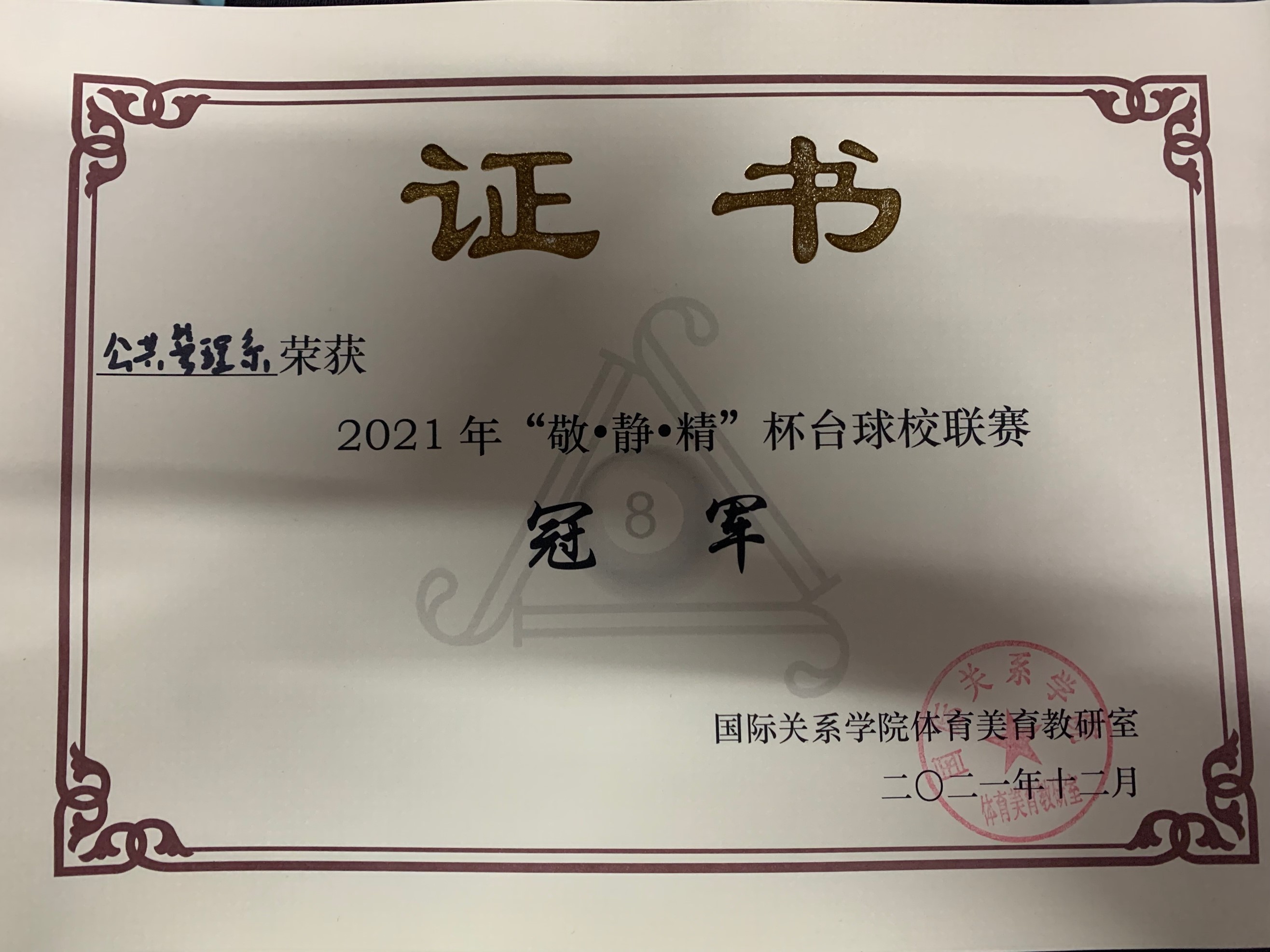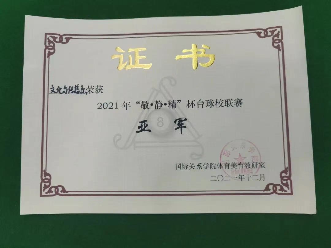 2021年12月10日,随着最后一场比赛的结束,国际关系学院“敬·静·精”杯台球校联赛圆满落幕。本次比赛共有51名同学报名参加,分为单打比赛和双打比赛。经过激烈的角逐后,按照团体比赛制,公共管理系共获得第一名;文化与传播系位居第二名。