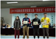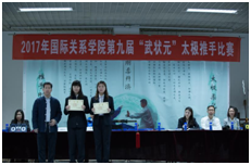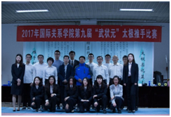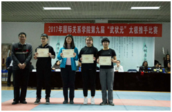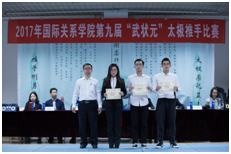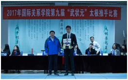 11月 29日下午,由国际关系学院体育委员会主办,体育美育教研部承办,国关武术协会,院武术队及武术文化研究部联合协办的第九届“武状元”推手大赛在院武术馆圆满落幕。出席本次大赛的嘉宾有国际关系学院郭惠民副校长、李家兴副校长、教务处许可处长、学生处芮雪源处长、国政系系林立民主任和体美部尹钊主任和北京少儿武术研究会常务会长及兼秘书长王天明先生。