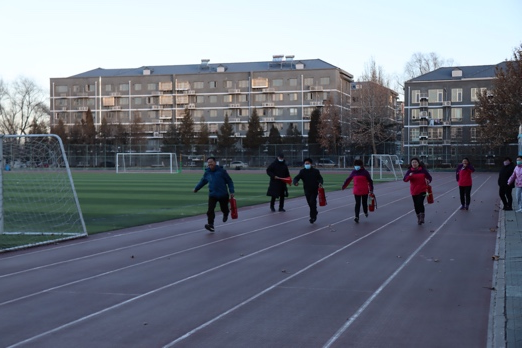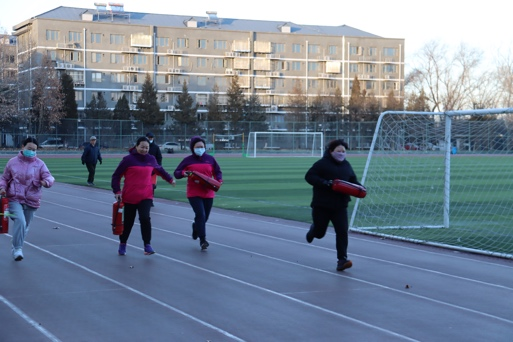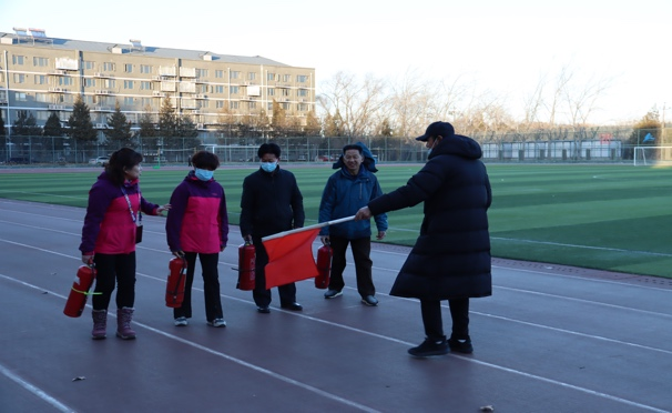 2021年1月4日在田径场跑道和南侧空地,设置30米跑道,终点处放置火盆,每人抱灭火器跑到终点用灭火器将明火扑灭(当日风大,为避免事故,没有点明火)。统计时间,按用时长短和使用灭火器的规范程度排名。