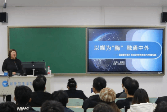 2024年12月11日18:00,《以媒为“酶”,融通中外》讲座在教学楼106教室举行。阴老师从《高端访谈》栏目创办初衷,内容构建,制作原则,传播实践,外联挑战五个方面展开。
