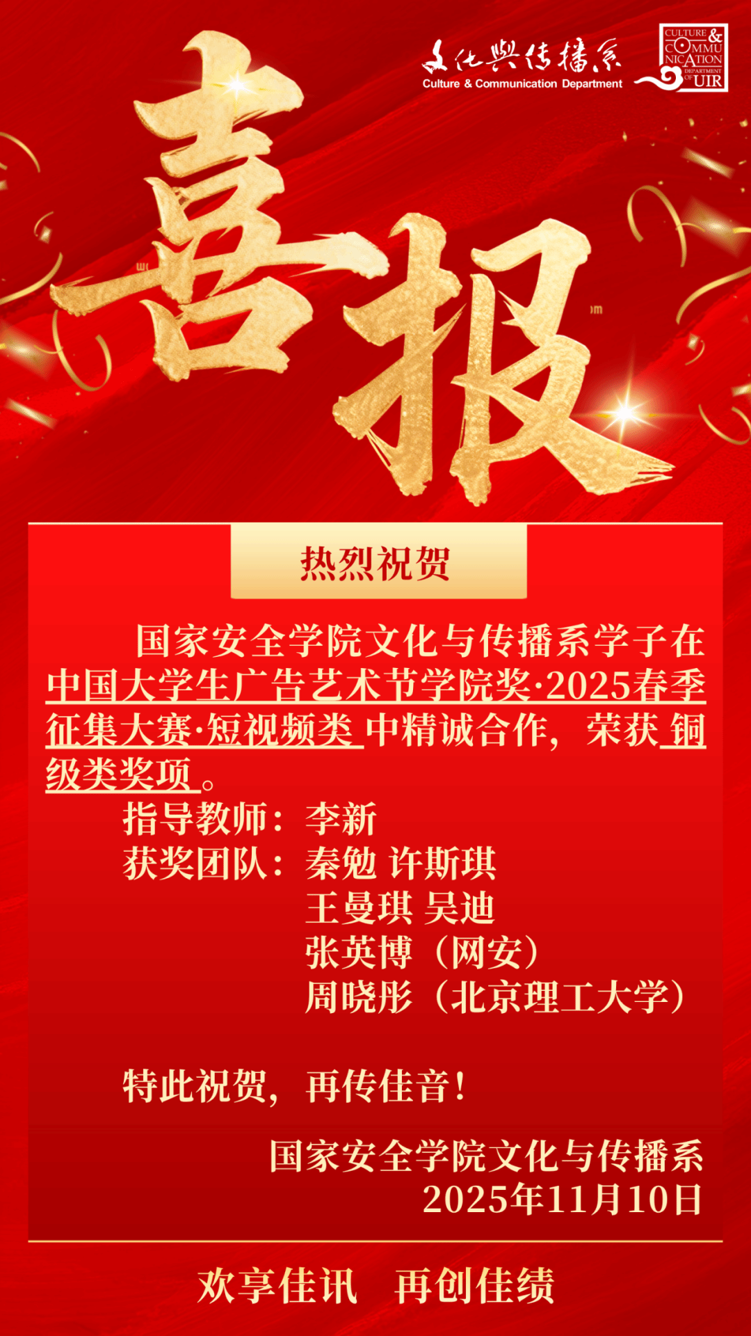 近期,我系学生在多项国家级和省部级高水平学科竞赛中奋勇争先,捷报频传,斩获了各类奖项,充分展现了我系学子扎实的专业功底、卓越的创新能力和全面的综合素养,为学校和文传系赢得了荣誉!