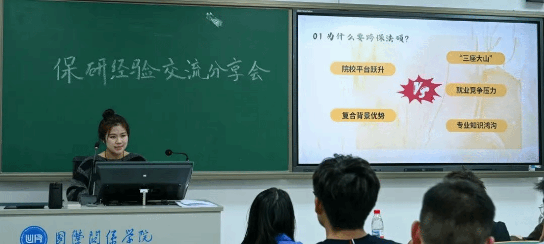 第二位上台发言的是跨专业保研至浙江大学光华法学院的毛翊菲学姐,“保研是一场苦乐参半的大冒险”,她用一句话总结了她的感受。