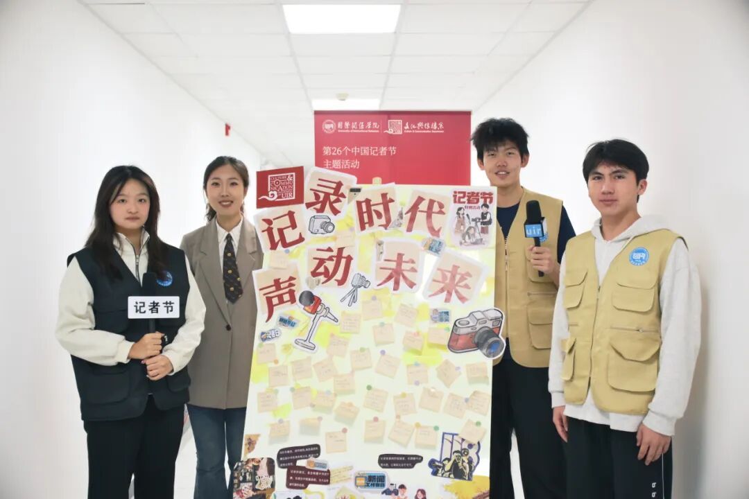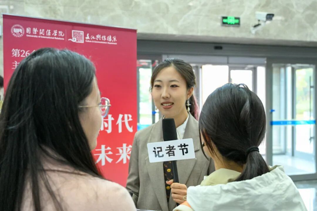 参与者佩戴印有“国关记者”标识的道具,手持融入校园元素的采访话筒,在镜头前定格职业向往,每一张合影都承载着对新闻职业的庄重期许。