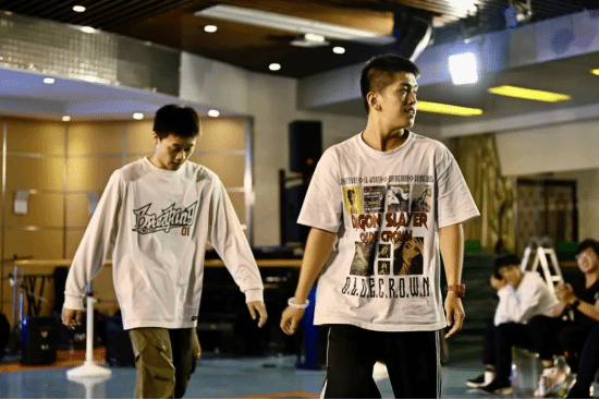 赵凯灵活的身姿在音乐的节奏中起伏,每一个转身都带有街舞特有的流畅和力量,每一个动作都充满力量和节奏感,仿佛在空气中划出了一道道看不见的旋律。