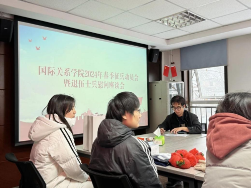 从戎无畏 激扬青春|2024春季征兵动员暨退伍士兵慰问座谈会顺利举行12月14日下午,国际关系学院2024年春季征兵动员暨退伍士兵慰问座谈会在润英楼三楼会议室举行,全体在校退伍士兵和意向报名参军同学参会。学生处处长(党委武装部部长)吴启春老师出席会议,会议由学生处杜娟老师主持。...2023.12.18