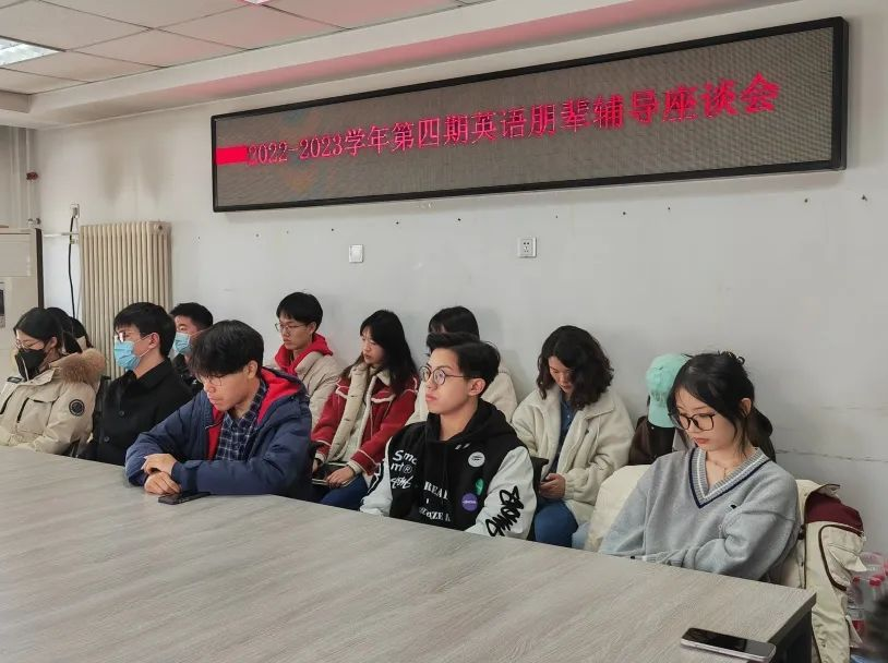 2023年2月23日中午,第四期英语朋辈辅导座谈会在润英楼三楼会议室举行。党委学工部部长、学生处处长冯幼民、学生处杜娟及全体英语导员共同参与了本次座谈会。杜娟老师主持会议。