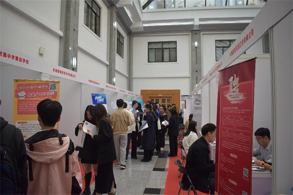 10月31日,2023年秋季校园招聘会暨2024届毕业生第一场校园招聘会在学术交流中心中厅成功举办,通用技术集团国际控股有限公司、中国海外工程有限责任公司、中智国际教育科技(北京)有限公司、北京双高志信人力资源有限公司、北京军密安检测评估有限公司等50家单位参加,单位涵盖政务、金融、互联网、外贸、教育等行业和领域,央企国企等体制内单位参会比例超过一半,共提供500多个岗位,300余名毕业生及其他年级学生参加。