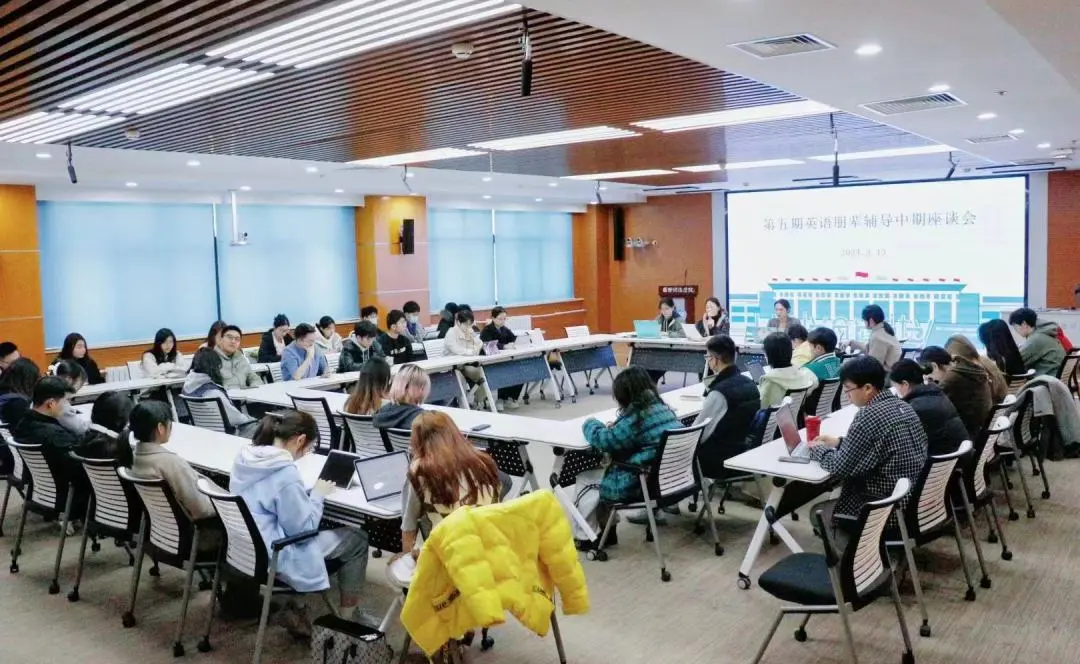 3月13日中午,第五期英语朋辈辅导中期座谈会在学术交流中心第二会议室举行。学生处杜娟老师与全体英语导员、学生助理共同参与了此次座谈会。