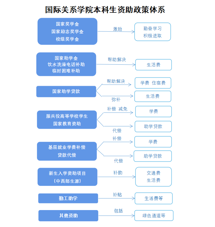 国际关系学院高度重视学生资助工作,在落实国家各项资助政策的基础上,完善校内奖助制度,建立了以“奖助贷勤补”为主体的、“多元混合”的学生资助体系,稳步推进精准资助,不让一个学生因家庭经济困难而失学。