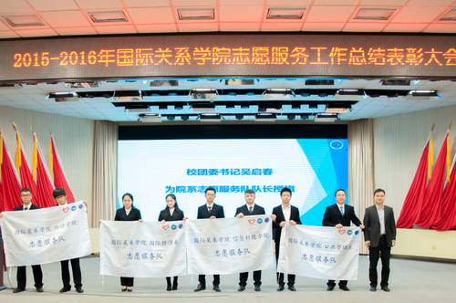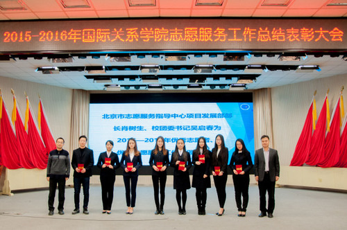 2016年12月7日14时,国际关系学院2015-2016年度志愿服务工作总结表彰大会在学交一放召开。国际关系学院副校长李家兴老师、北京市志愿服务指导中心项目发展部部长肖树生老师、校团委书记吴启春老师、校团委副书记余甚蓝老师、志愿服务联合会成员及志愿者代表出席了本次大会。