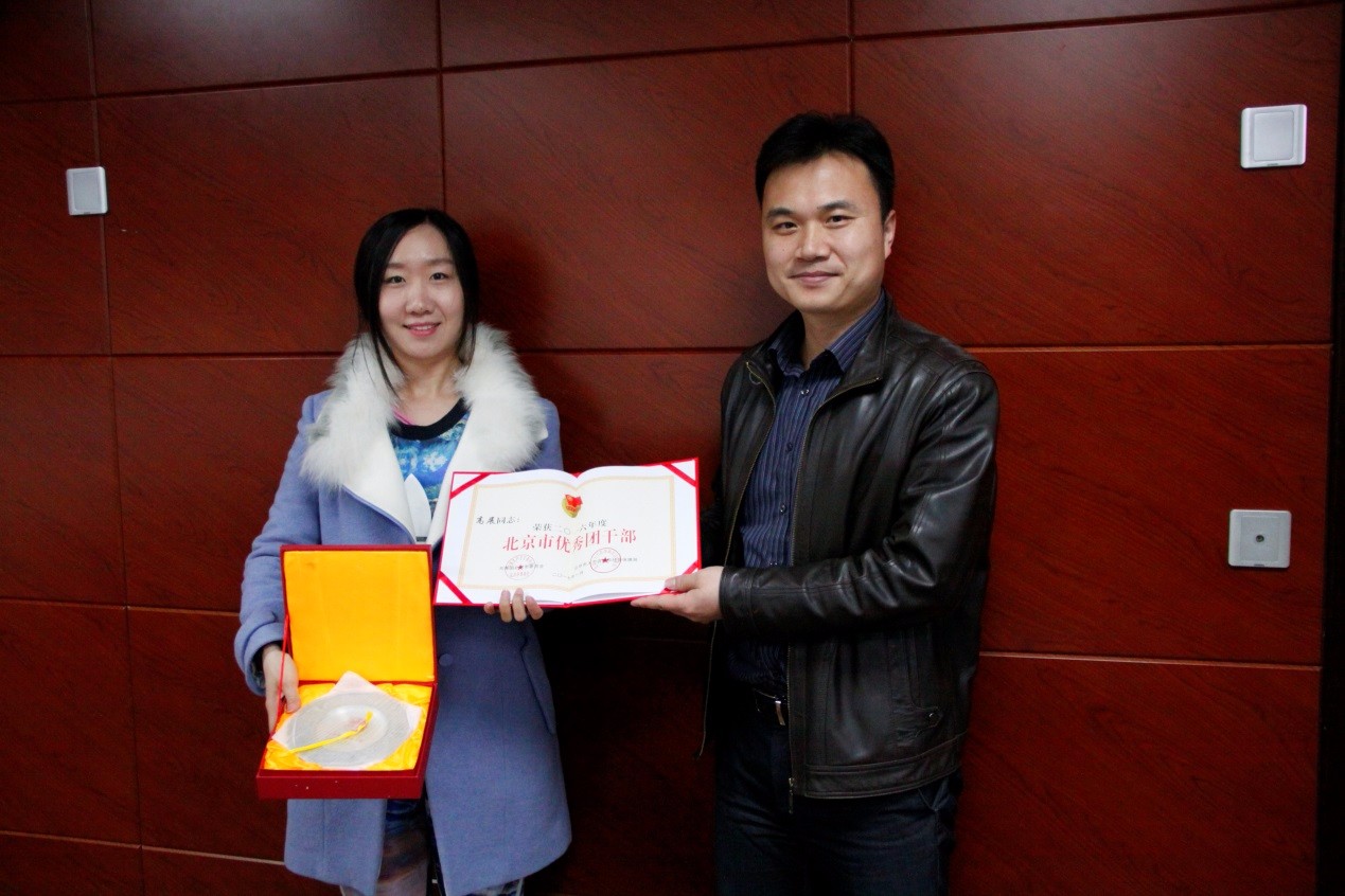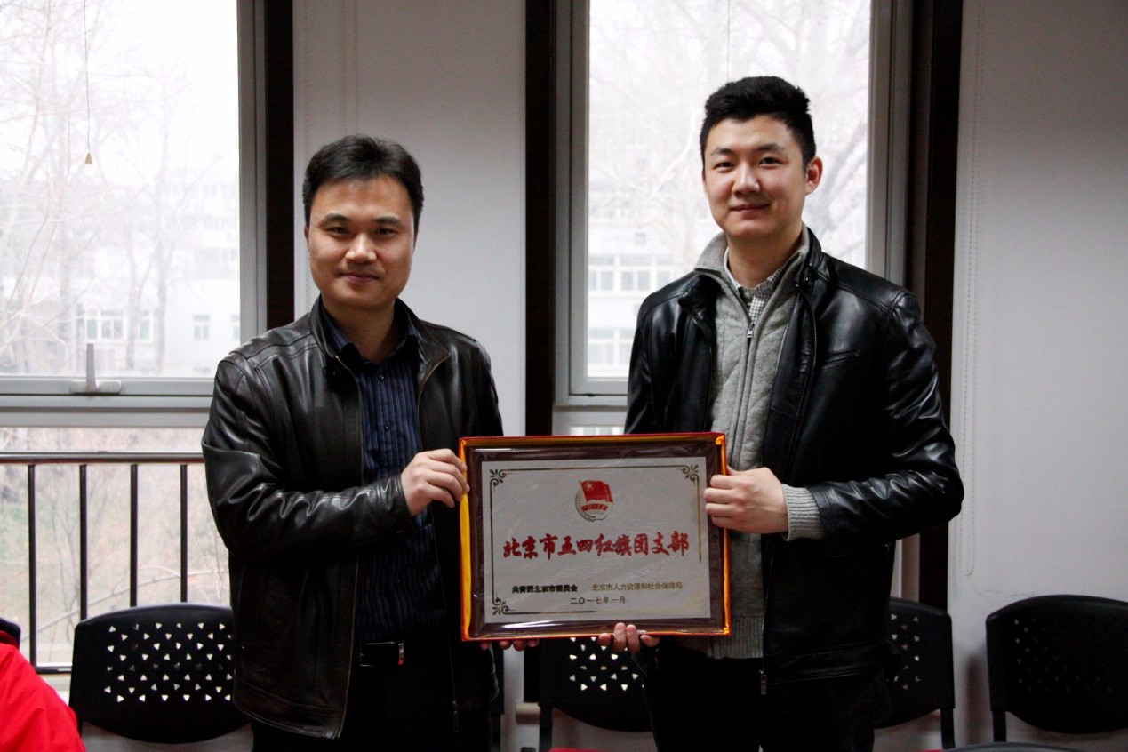 会议最后举行了简短的颁奖仪式。2016年度,我校共青团认真落实上级团组织各项工作要求,稳妥推进各项工作任务,圆满完成工作计划,在北京团市委2016年度评优奖励中获得了较好评价。其中,外语学院法语1402团支部荣获“北京市五四红旗团支部”,国际经济系团总支书记高展荣获 “北京市优秀共青团干部”称号。