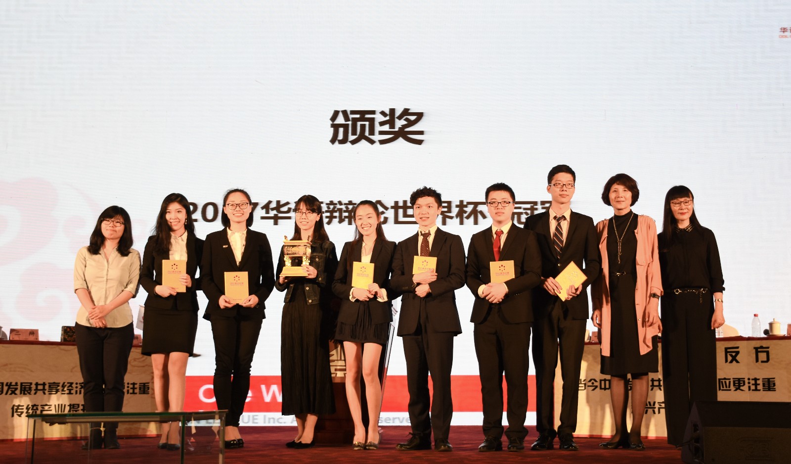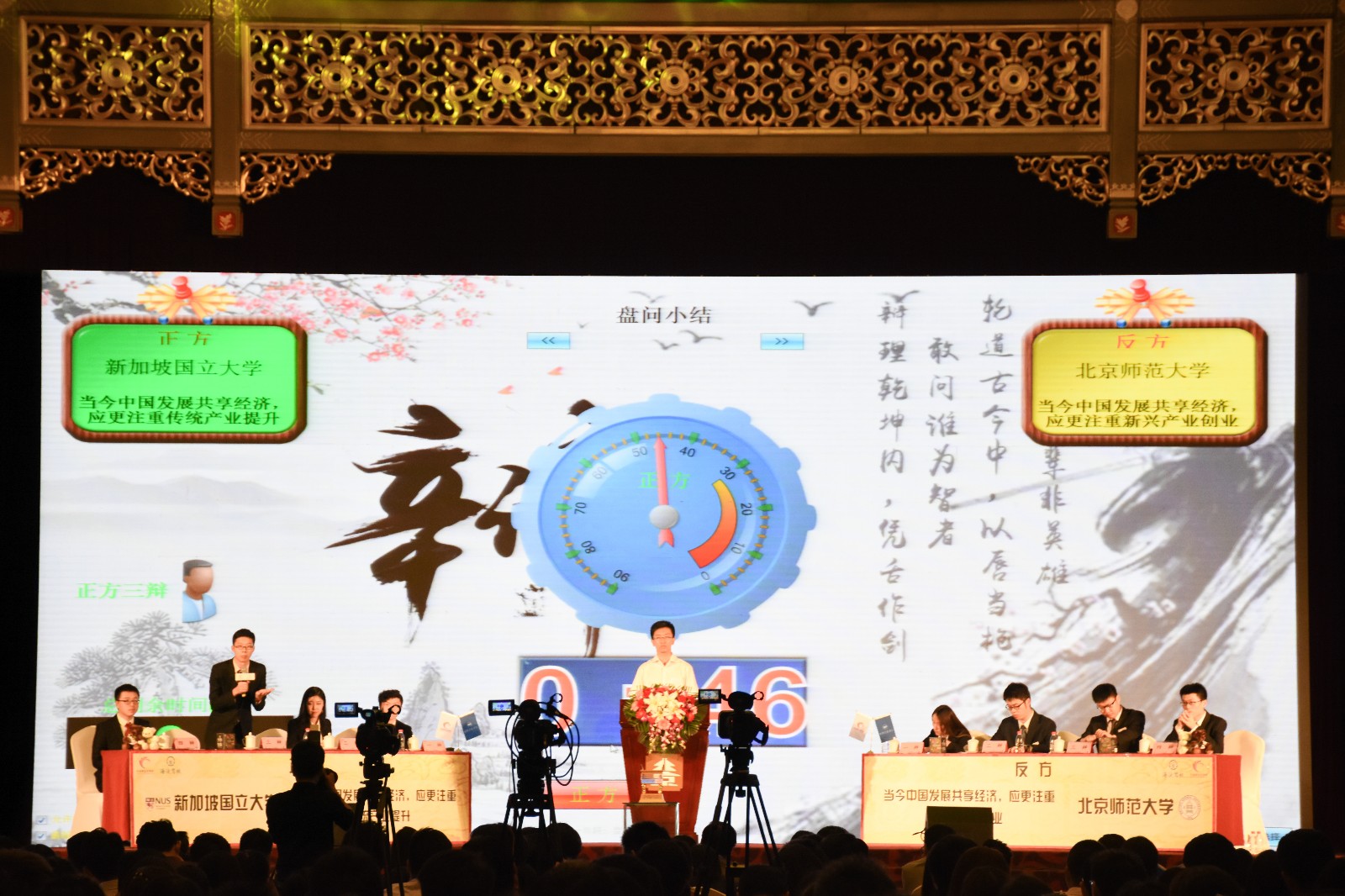在比赛环节,正方新加坡国立大学以“嘀嘀打车”与“ofo共享单车”为例,从社会整体利益出发,阐释了传统产业的提升对于社会整体效益提升的意义。反方北京师范大学强调了新兴行业核心优势在于其提供的多元化的服务内容,传统产业无法比拟。本次华语辩论世界杯采用的评委述票制不仅是对比赛本身的精彩点评,更是面向华语辩论圈辩手们的经验传授。七位评委坐到了台上所投“印象票”的一方并分别阐述投票理由,在述票环节四位评委支持正方、三位评委支持反方,比赛激烈程度可见一斑。评委们依次从正反双方的可贵之处和遗憾之点出发进行述票,用同样精炼的语言、不同的出发点带来了一场难得一遇的视听盛宴。最终,结合赛时评委对每个环节打分而得的环节票及评委们完成述票后投出的决胜票,新加坡国立大学夺得桂冠、荣获金鼎,卫冕冠军北京师范大学荣获亚军。