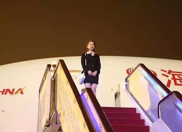 我校志愿者扮演“智利总统”走下舷梯与外交部礼宾司司长秦刚握手