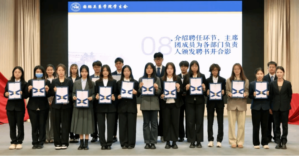 主席团成员为学生会各部门负责人颁发聘书并合影留念。